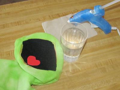 Next we placed the mouth inside the slit and hot glued it in place. We learned a great trick about using cold water while pressing the mouth and fleece together so that we wouldn’t burn our fingers. We still let mom handle most of the hot glue and sewing as we are still learning.